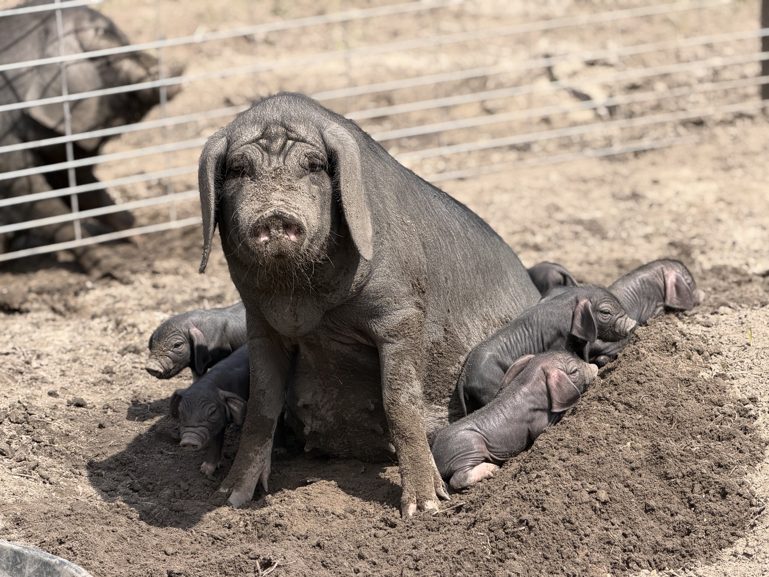 Meishan pigs have been bred to be extremely quiet, docile, and sedentary. This allows us to work with them closely and comfortably and spend time inside the pens with the piglets from the time they are born. Being able to work around and easily manage them with little stress is very important to us and makes the pigs happier.